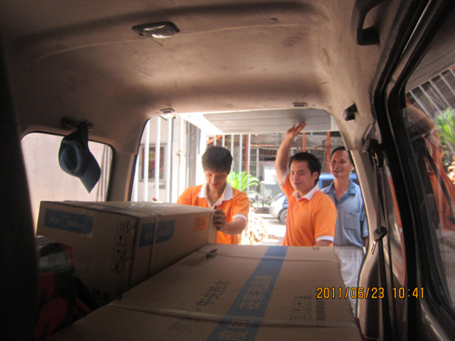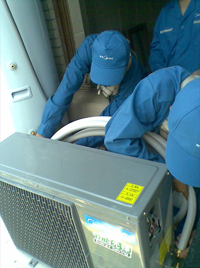 2、美的專業安裝師傅正與用戶一同給用戶拆箱,并按說明書檢查箱內物品狀況。